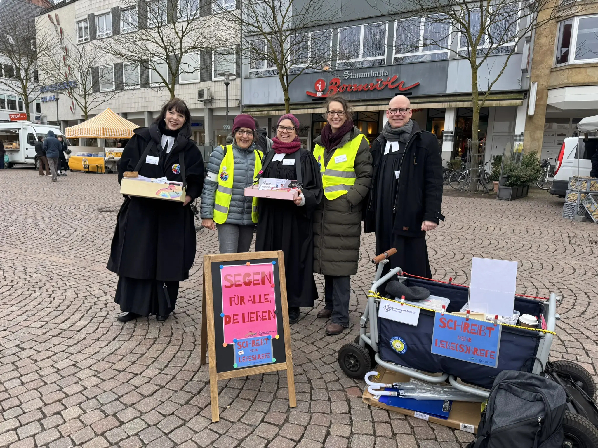 Die jüngste Aktion war eine Segensaktion zum Valentinstag am 14. Februar auf dem Marktplatz in Darmstadt. Unter dem Motto „Segen für alle, die lieben“ bot ein Team von FEST im Leben am Valentinstag an, sich spontan segnen zu lassen. Viele gute Begegnungen und berührende Gespräche erlebten Pfarrerin Astrid Maria Horn, Stellvertretender Dekan Sven Sabary, Pfarrerin Ilka Friedrich, Pfarrerin Dr. Anna Scholz, Gemeindepädagogin Tabea Dauth und Ehrenamtliche bei FEST im Leben Christine Schäfer. Mit im Gepäck hatten sie Bauchläden mit Segen zum Weitergeben. Auch Liebesbriefe konnten geschrieben werden, Versand inklusive.