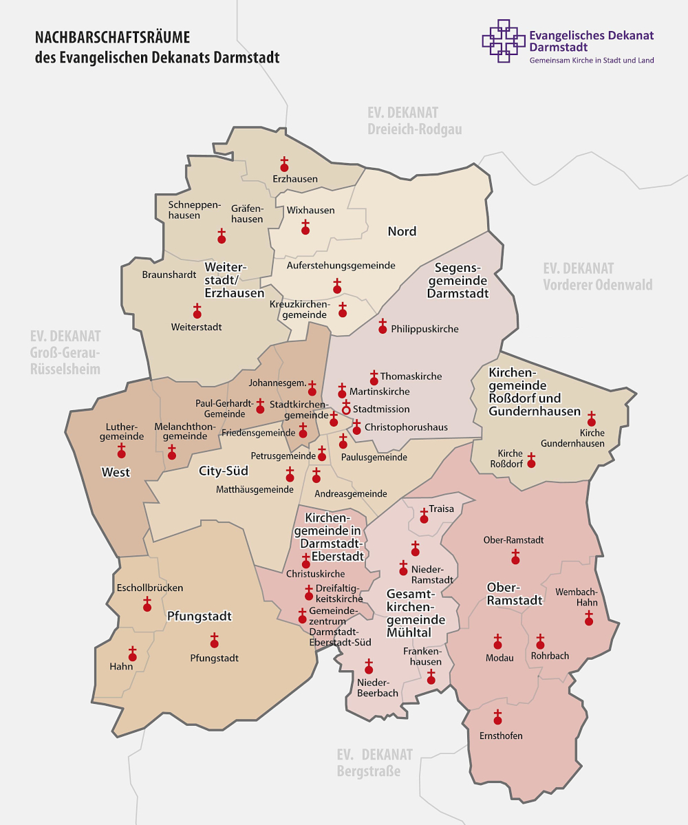 Nachbarschaftsraum Weiterstadt-Erzhausen Nachbarschaftsraum Nord Nachbarschaftsraum West Segensgemeinde Darmstadt Nachbarschaftsraum Rossdorf/Gundernhausen Nachbarschaftsraum Pfungstadt Nachbarschaftsraum City Süd Nachbarschaftsraum Eberstadt Gesamtkirchengemeinde Muehltal Nachbarschaftsraum Ober-Ramstadt
